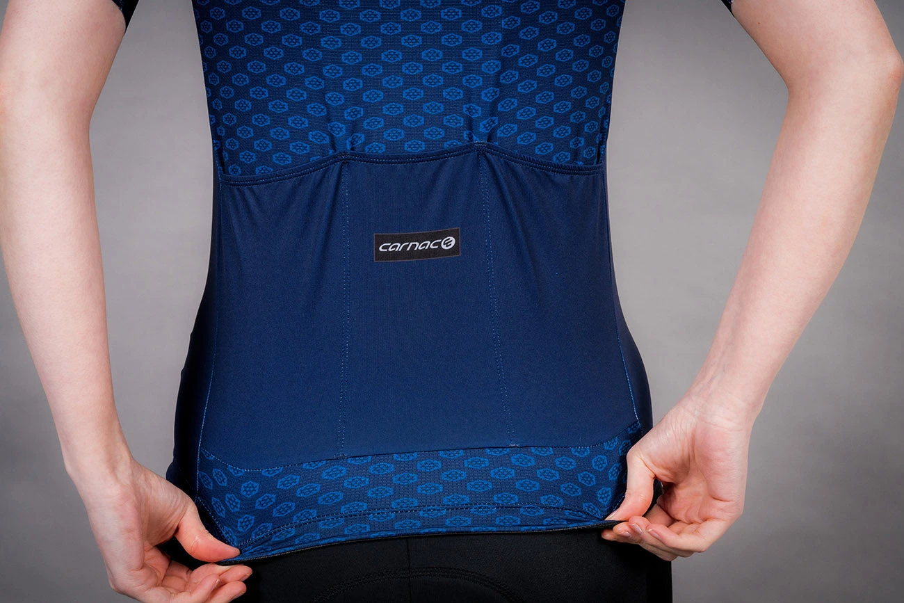 The Carnac Womens Short Sleeve Cycling Jersey is designed to be a comfortable and essential piece of your cycling kit. Whether you’re out for a quick, short ride after work or spending the whole afternoon in the saddle, the Carnac Short Sleeve Cycling Jersey is a brilliant go-to Jersey. Laser cut sleeves give unrestrictive support and comfort and the bottom of the jersey features a silicone gripper strip, to keep things in place and allow a full range of motion, so you can concentrate on enjoying your ride. The Carnac Short Sleeve Cycling Jersey is constructed from premium Italian fabric, featuring a technical grid mesh rear panel, to maximise breathability, without losing protection from wind chill at the front. Three ergonomically placed rear pockets provide ample space for all your ride essentials. The Short Sleeve Cycling Jersey features Carnacs sport fit. This cut is more streamlined and fitted than the relaxed fit jersey but is not worn as close to the body as race fit jerseys. The Short Sleeve Cycling Jersey is Carnacs do-it-all, cycling apparel essential. A super comfortable jersey that performs effortlessly giving you the support and comfort you want on every bike ride.