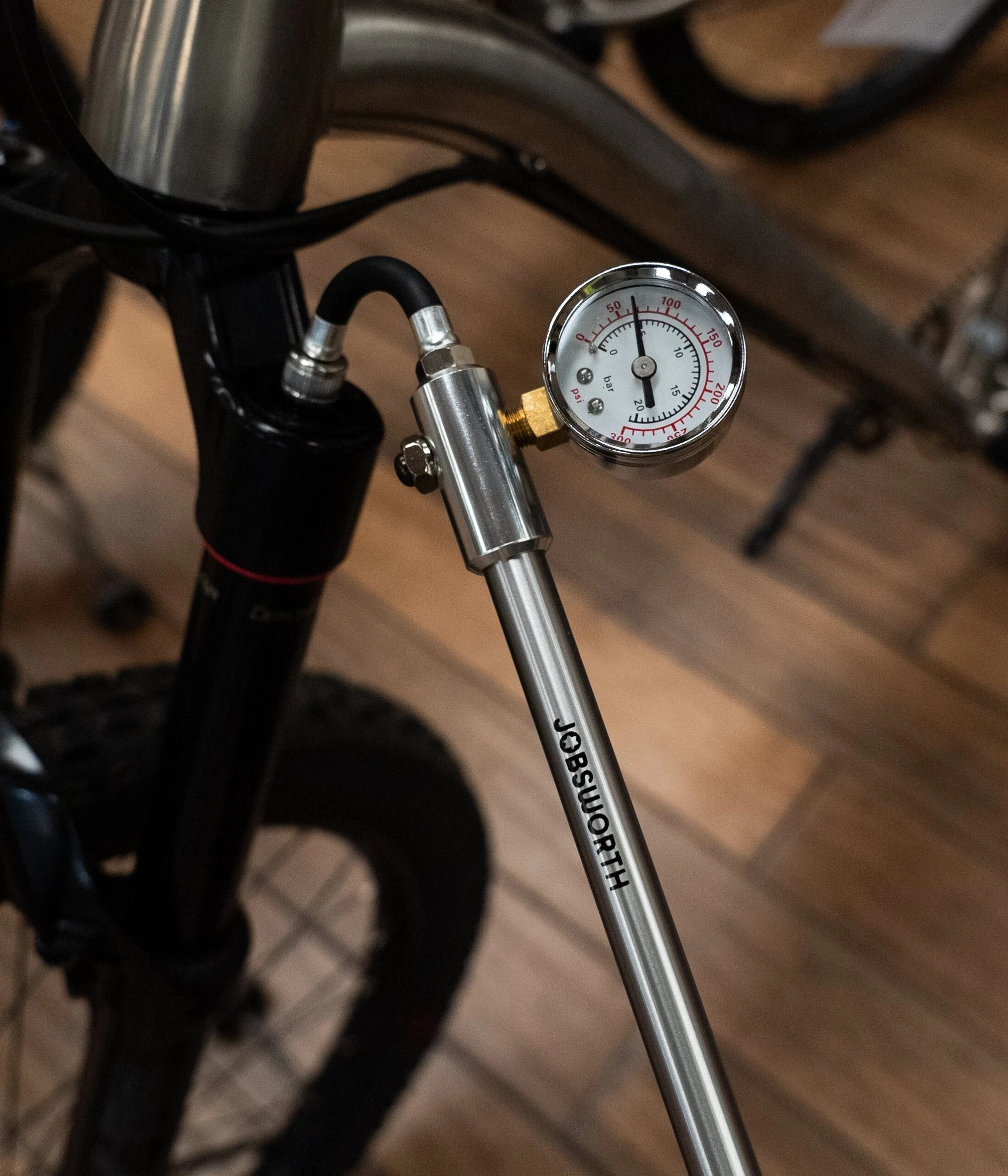 he Jobsworth Workshop Shock pump features a Durable Precision CNC aluminium construction and Precise Pressure Gauge for perfect shock or fork setup.