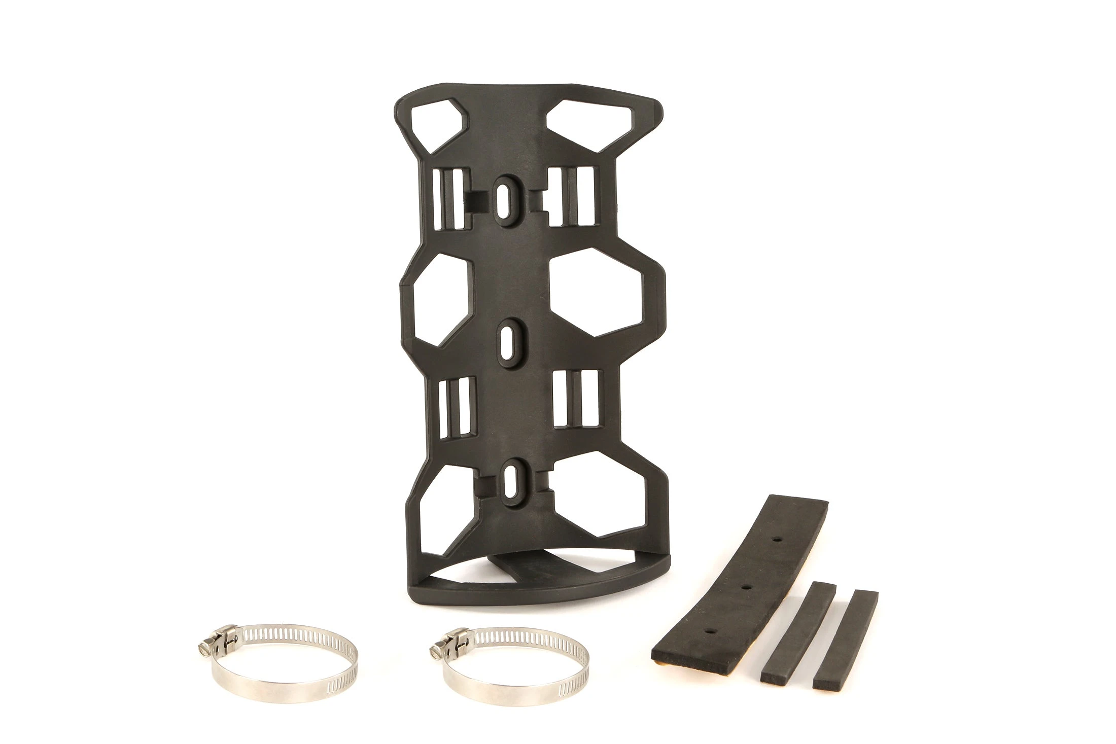 Reinforced fibreglass frame that easily mounts to your forks, with a selection of jubilee clips, sticky back foam pads, heavy duty zip ties and webbing straps you have a huge number of option of how to connect your kit to your bike